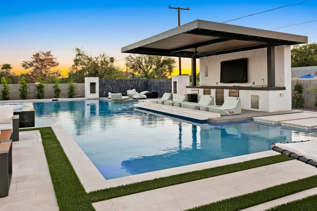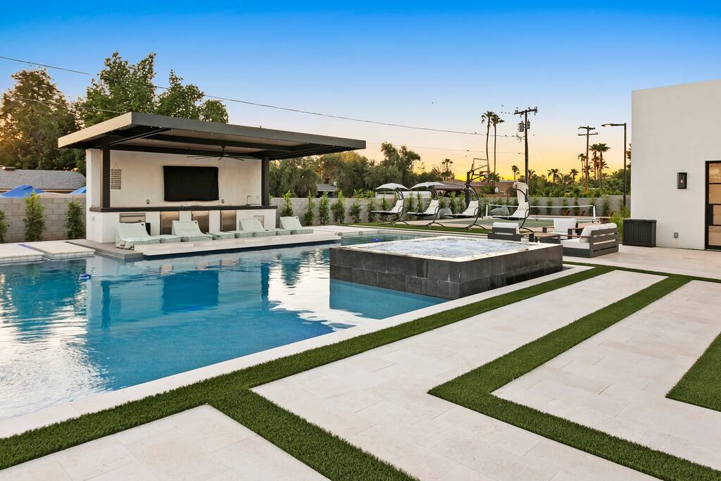 ✨Luxury 6BR Villa – Sleeps 22.✨ Private pickleball & half-court basketball, resort-style heated pool & spa with swim-up bar, movie lounge and golf simulator—all minutes from Old Town Scottsdale Kierland Commons and Scottsdale Quarter Entertainment pavilion: Pickleball, putting green, ping-pong outdoor pool table & arcade Resort pool, spa, firepit & misting system Designer kitchen + indoor/outdoor dining Keyless entry & super-fast response Book your Scottsdale showstopper retreat today!