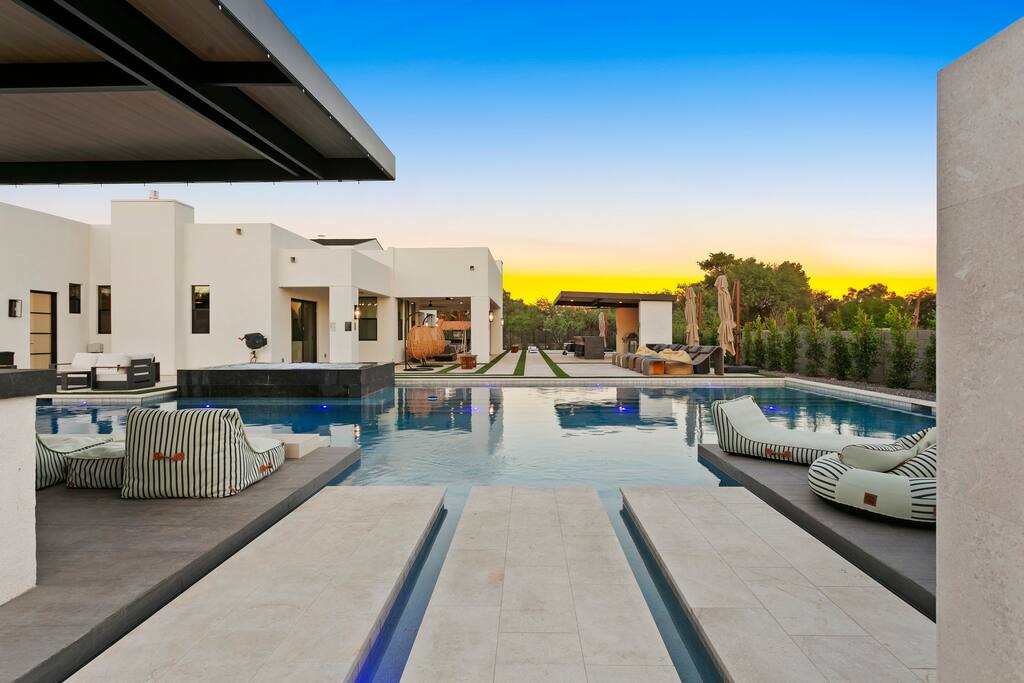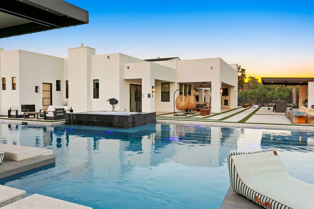 Rooms & Spaces Private Suites: Retreat each night to spacious, elegantly appointed bedrooms featuring premium mattresses, plush linens, and serene décor. Many offer private or semi-private bathrooms, ensuring comfort and privacy for every guest. Nature-Inspired Movie Lounge: Step into a one-of-a-kind entertainment retreat where the outdoors meets the big screen. Our 132-inch projection screen, powered by a state-of-the-art AWOL short-throw projector, transforms the room into a private cinema—perfect for movie nights, binge-worthy series, or game-day excitement. Designed with a calming, nature-themed aesthetic, the space blends comfort with a touch of the outdoors, offering guests a cozy yet elevated vibe. The plush sectional doubles as a couch bed that sleeps up to 4, making this the ultimate spot for families, kids’ sleepovers, or friends who want to combine movie magic with a restful night’s sleep. Whether you’re looking to unwind after a day of golf and desert adventures or create a memorable family movie night, this room is built to impress and designed to relax. Spa-Inspired Bathrooms: Indulge in walk-in showers, soaking tub, and luxury toiletries that transform daily routines into spa moments. Grand Living Room: A sunlit great room with soaring ceilings, designer furnishings, and walls of glass that open seamlessly to the outdoors—perfect for gathering, relaxing, or celebrating. Gourmet Kitchen & Dining: A chef’s dream with top-tier appliances, expansive prep space, and seating for your entire group—ideal for cooking together or enjoying a catered dinner. Entertainment Pavilion: Your own private resort hub featuring a state-of-the-art golf simulator, lively ping pong battles, classic arcade speedball challenges, competitive foosball matches, a pickleball court, a basketball court (half) and a putting green for golf enthusiasts of all levels. A space designed for laughter, friendly rivalry, and unforgettable memories. Outdoor Oasis: A resort-style pool and spa featuring a swim-up bar and a soothing water wall, surrounded by shaded lounge areas with a fireplace, a BBQ station, and manicured grounds enhanced with cooling outdoor misters to keep you comfortable even on the hottest days. Gather around the cozy firepit for starlit evenings filled with warmth and conversation—perfect for sun-soaked afternoons and magical nights alike. List of amenities include: A pickleball court Half court basketball Celebrity Greens Putting Green (outdoor) Cornhole In pool seats Resort style pool with LED lighting and spa Firepit Misting system Convenient Parking: Ample on-site parking to accommodate all guests with ease. -------------------------------------------------------------------- Scottsdale Highlights & Travel Times 1. Old Town Scottsdale & the Arts District Immerse yourself in walkable galleries, stylish boutiques, Southwestern cuisine, and vibrant nightlife. • Drive time: Approximately 10–12 minutes (about 5 miles). 2. TPC Scottsdale & Waste Management Phoenix Open Home to the famed Stadium Course and its electrifying 16th-hole coliseum—this is golf like no other. • Drive time: Around 12–15 minutes (roughly 6–7 miles). 3. Taliesin West Explore Frank Lloyd Wright’s iconic desert compound and creativity hub—an architectural marvel you won't want to miss. • Drive time: Circa 15 minutes (approx. 7 miles). 4. Scottsdale Arabian Horse Show & Barrett-Jackson Auction (WestWorld) From the grandeur of the Arabian Horse Show to the classic car excitement at Barrett-Jackson and festive Parada del Sol, WestWorld delivers unmatched cultural flair. • Drive time: About 15 minutes (6–8 miles). 5. Arizona Boardwalk Attractions A family entertainment cluster featuring OdySea Aquarium, Butterfly Wonderland, Museum of Illusions, and more—perfect for all ages. • Drive time: Approximately 15 minutes (6–7 miles). 6. Luxury Spas, Shopping & Nightlife Spoil yourself at resorts like The Phoenician or enjoy high-end fashion and evening glamour at Scottsdale Fashion Square. • Drive time: Roughly 10–12 minutes to Scottsdale Fashion Square, and similar to nearby resort venues. Why Staying Here Is a Smart Choice • Central Location: You’re nestled in a serene upscale neighborhood that provides a peaceful refuge—yet you're just minutes from everything that makes Scottsdale unforgettable. • Something for Everyone: Whether it's art, history, golf, horses, family fun, or luxury indulgence, your guests won’t have to travel far. • Quick Access: With most top attractions just a short drive away, guests can maximize their time—whether they’re here for weekend play or a multi-day retreat.