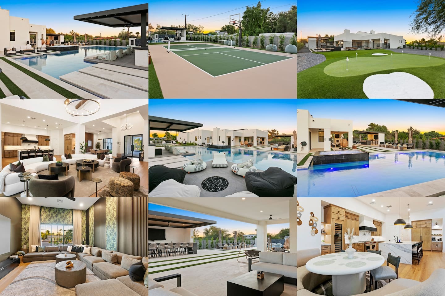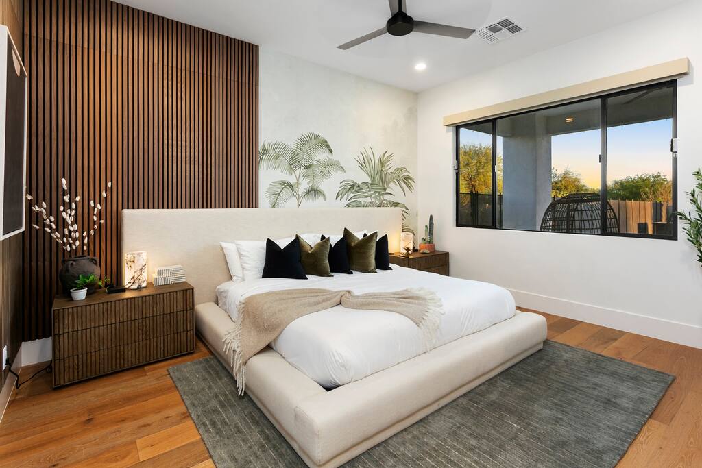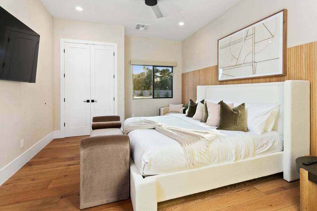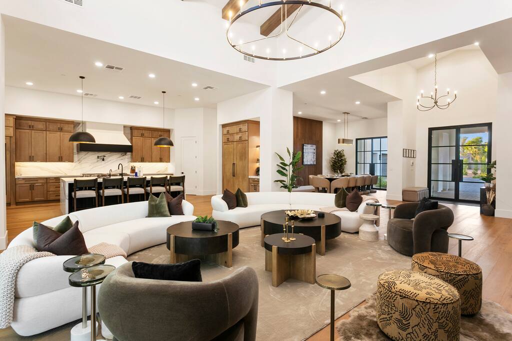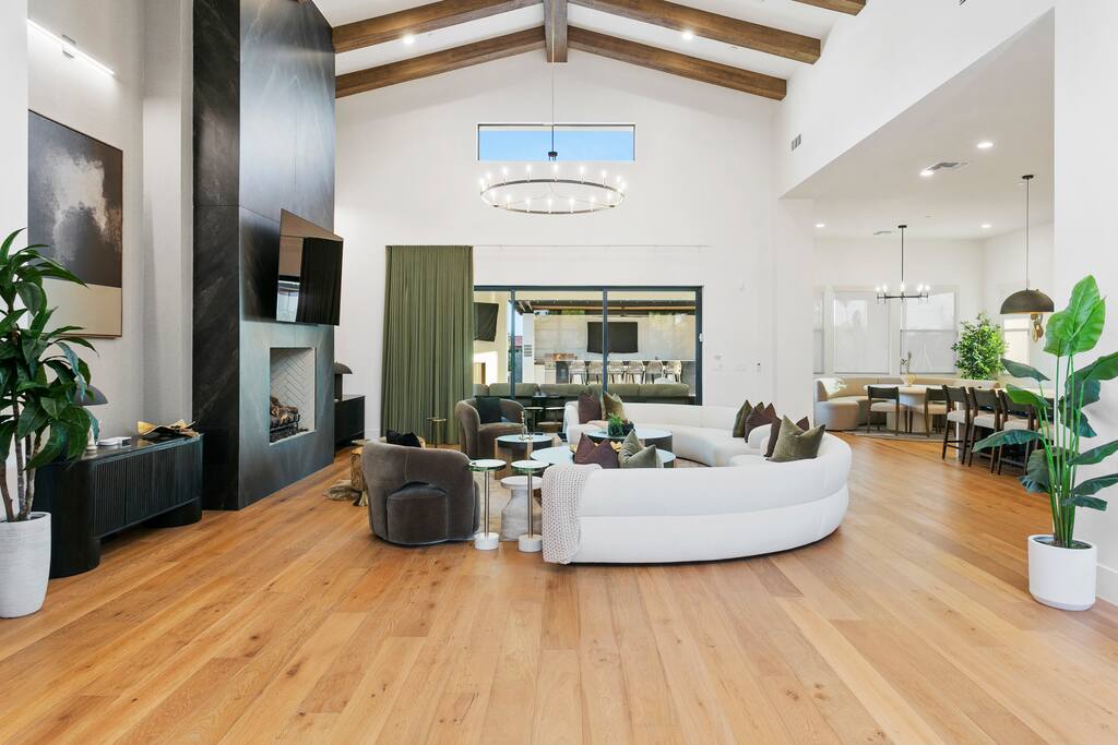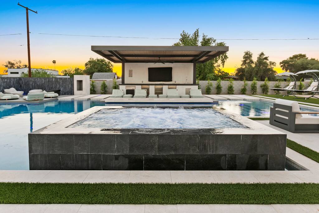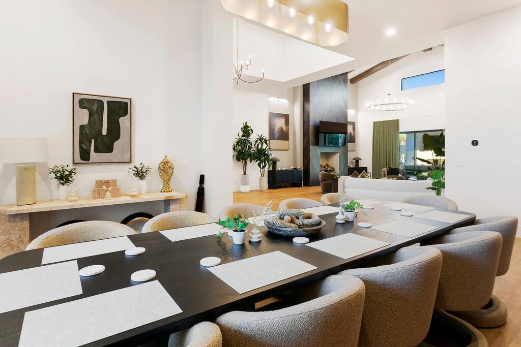 Rooms & Spaces Private Suites: Retreat each night to spacious, elegantly appointed bedrooms featuring premium mattresses, plush linens, and serene décor. Many offer private or semi-private bathrooms, ensuring comfort and privacy for every guest. Nature-Inspired Movie Lounge: Step into a one-of-a-kind entertainment retreat where the outdoors meets the big screen. Our 132-inch projection screen, powered by a state-of-the-art AWOL short-throw projector, transforms the room into a private cinema—perfect for movie nights, binge-worthy series, or game-day excitement. Designed with a calming, nature-themed aesthetic, the space blends comfort with a touch of the outdoors, offering guests a cozy yet elevated vibe. The plush sectional doubles as a couch bed that sleeps up to 4, making this the ultimate spot for families, kids’ sleepovers, or friends who want to combine movie magic with a restful night’s sleep. Whether you’re looking to unwind after a day of golf and desert adventures or create a memorable family movie night, this room is built to impress and designed to relax. Spa-Inspired Bathrooms: Indulge in walk-in showers, soaking tub, and luxury toiletries that transform daily routines into spa moments. Grand Living Room: A sunlit great room with soaring ceilings, designer furnishings, and walls of glass that open seamlessly to the outdoors—perfect for gathering, relaxing, or celebrating. Gourmet Kitchen & Dining: A chef’s dream with top-tier appliances, expansive prep space, and seating for your entire group—ideal for cooking together or enjoying a catered dinner. Entertainment Pavilion: Your own private resort hub featuring a state-of-the-art golf simulator, lively ping pong battles, classic arcade speedball challenges, competitive foosball matches, a pickleball court, a basketball court (half) and a putting green for golf enthusiasts of all levels. A space designed for laughter, friendly rivalry, and unforgettable memories. Outdoor Oasis: A resort-style pool and spa featuring a swim-up bar and a soothing water wall, surrounded by shaded lounge areas with a fireplace, a BBQ station, and manicured grounds enhanced with cooling outdoor misters to keep you comfortable even on the hottest days. Gather around the cozy firepit for starlit evenings filled with warmth and conversation—perfect for sun-soaked afternoons and magical nights alike. List of amenities include: A pickleball court Half court basketball Celebrity Greens Putting Green (outdoor) Cornhole In pool seats Resort style pool with LED lighting and spa Firepit Misting system Convenient Parking: Ample on-site parking to accommodate all guests with ease. -------------------------------------------------------------------- Scottsdale Highlights & Travel Times 1. Old Town Scottsdale & the Arts District Immerse yourself in walkable galleries, stylish boutiques, Southwestern cuisine, and vibrant nightlife. • Drive time: Approximately 10–12 minutes (about 5 miles). 2. TPC Scottsdale & Waste Management Phoenix Open Home to the famed Stadium Course and its electrifying 16th-hole coliseum—this is golf like no other. • Drive time: Around 12–15 minutes (roughly 6–7 miles). 3. Taliesin West Explore Frank Lloyd Wright’s iconic desert compound and creativity hub—an architectural marvel you won't want to miss. • Drive time: Circa 15 minutes (approx. 7 miles). 4. Scottsdale Arabian Horse Show & Barrett-Jackson Auction (WestWorld) From the grandeur of the Arabian Horse Show to the classic car excitement at Barrett-Jackson and festive Parada del Sol, WestWorld delivers unmatched cultural flair. • Drive time: About 15 minutes (6–8 miles). 5. Arizona Boardwalk Attractions A family entertainment cluster featuring OdySea Aquarium, Butterfly Wonderland, Museum of Illusions, and more—perfect for all ages. • Drive time: Approximately 15 minutes (6–7 miles). 6. Luxury Spas, Shopping & Nightlife Spoil yourself at resorts like The Phoenician or enjoy high-end fashion and evening glamour at Scottsdale Fashion Square. • Drive time: Roughly 10–12 minutes to Scottsdale Fashion Square, and similar to nearby resort venues. Why Staying Here Is a Smart Choice • Central Location: You’re nestled in a serene upscale neighborhood that provides a peaceful refuge—yet you're just minutes from everything that makes Scottsdale unforgettable. • Something for Everyone: Whether it's art, history, golf, horses, family fun, or luxury indulgence, your guests won’t have to travel far. • Quick Access: With most top attractions just a short drive away, guests can maximize their time—whether they’re here for weekend play or a multi-day retreat.