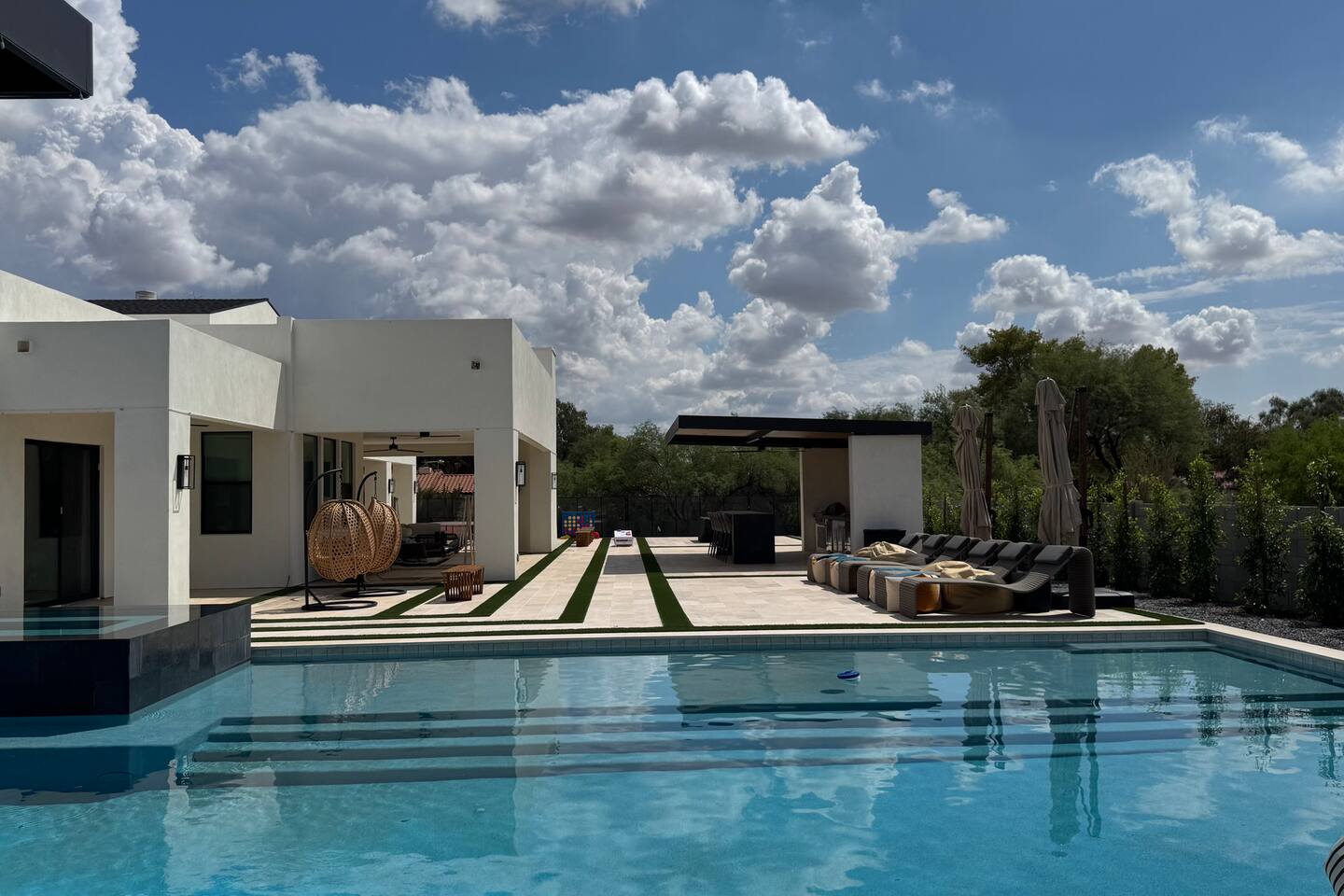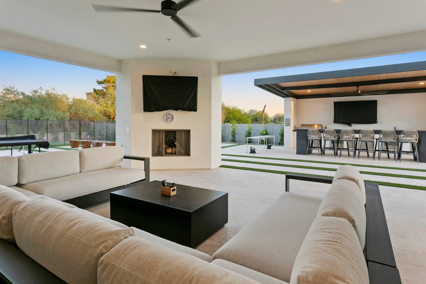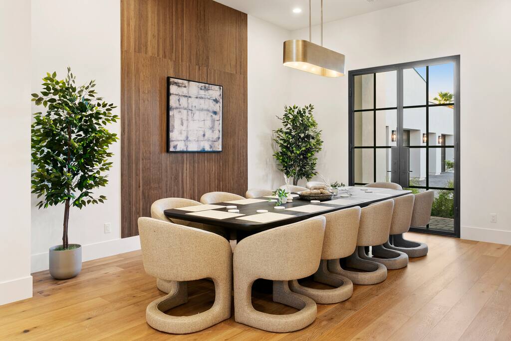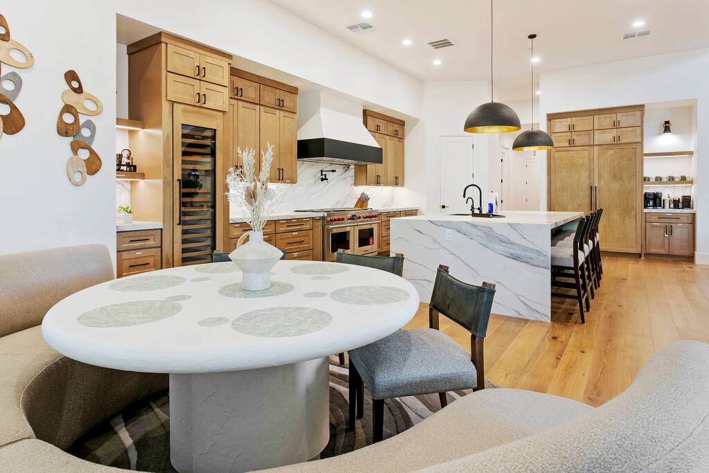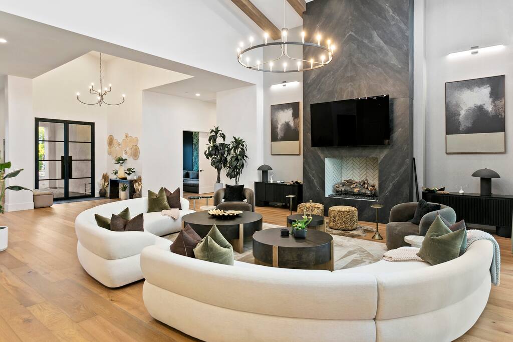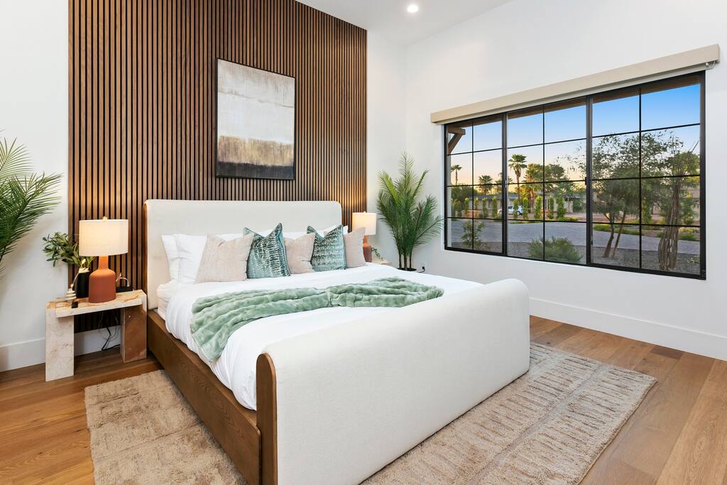 Rooms & Spaces Private Suites: Retreat each night to spacious, elegantly appointed bedrooms featuring premium mattresses, plush linens, and serene décor. Many offer private or semi-private bathrooms, ensuring comfort and privacy for every guest. Nature-Inspired Movie Lounge: Step into a one-of-a-kind entertainment retreat where the outdoors meets the big screen. Our 132-inch projection screen, powered by a state-of-the-art AWOL short-throw projector, transforms the room into a private cinema—perfect for movie nights, binge-worthy series, or game-day excitement. Designed with a calming, nature-themed aesthetic, the space blends comfort with a touch of the outdoors, offering guests a cozy yet elevated vibe. The plush sectional doubles as a couch bed that sleeps up to 4, making this the ultimate spot for families, kids’ sleepovers, or friends who want to combine movie magic with a restful night’s sleep. Whether you’re looking to unwind after a day of golf and desert adventures or create a memorable family movie night, this room is built to impress and designed to relax. Spa-Inspired Bathrooms: Indulge in walk-in showers, soaking tub, and luxury toiletries that transform daily routines into spa moments. Grand Living Room: A sunlit great room with soaring ceilings, designer furnishings, and walls of glass that open seamlessly to the outdoors—perfect for gathering, relaxing, or celebrating. Gourmet Kitchen & Dining: A chef’s dream with top-tier appliances, expansive prep space, and seating for your entire group—ideal for cooking together or enjoying a catered dinner. Entertainment Pavilion: Your own private resort hub featuring a state-of-the-art golf simulator, lively ping pong battles, classic arcade speedball challenges, competitive foosball matches, a pickleball court, a basketball court (half) and a putting green for golf enthusiasts of all levels. A space designed for laughter, friendly rivalry, and unforgettable memories. Outdoor Oasis: A resort-style pool and spa featuring a swim-up bar and a soothing water wall, surrounded by shaded lounge areas with a fireplace, a BBQ station, and manicured grounds enhanced with cooling outdoor misters to keep you comfortable even on the hottest days. Gather around the cozy firepit for starlit evenings filled with warmth and conversation—perfect for sun-soaked afternoons and magical nights alike. List of amenities include: A pickleball court Half court basketball Celebrity Greens Putting Green (outdoor) Cornhole In pool seats Resort style pool with LED lighting and spa Firepit Misting system Convenient Parking: Ample on-site parking to accommodate all guests with ease. -------------------------------------------------------------------- Scottsdale Highlights & Travel Times 1. Old Town Scottsdale & the Arts District Immerse yourself in walkable galleries, stylish boutiques, Southwestern cuisine, and vibrant nightlife. • Drive time: Approximately 10–12 minutes (about 5 miles). 2. TPC Scottsdale & Waste Management Phoenix Open Home to the famed Stadium Course and its electrifying 16th-hole coliseum—this is golf like no other. • Drive time: Around 12–15 minutes (roughly 6–7 miles). 3. Taliesin West Explore Frank Lloyd Wright’s iconic desert compound and creativity hub—an architectural marvel you won't want to miss. • Drive time: Circa 15 minutes (approx. 7 miles). 4. Scottsdale Arabian Horse Show & Barrett-Jackson Auction (WestWorld) From the grandeur of the Arabian Horse Show to the classic car excitement at Barrett-Jackson and festive Parada del Sol, WestWorld delivers unmatched cultural flair. • Drive time: About 15 minutes (6–8 miles). 5. Arizona Boardwalk Attractions A family entertainment cluster featuring OdySea Aquarium, Butterfly Wonderland, Museum of Illusions, and more—perfect for all ages. • Drive time: Approximately 15 minutes (6–7 miles). 6. Luxury Spas, Shopping & Nightlife Spoil yourself at resorts like The Phoenician or enjoy high-end fashion and evening glamour at Scottsdale Fashion Square. • Drive time: Roughly 10–12 minutes to Scottsdale Fashion Square, and similar to nearby resort venues. Why Staying Here Is a Smart Choice • Central Location: You’re nestled in a serene upscale neighborhood that provides a peaceful refuge—yet you're just minutes from everything that makes Scottsdale unforgettable. • Something for Everyone: Whether it's art, history, golf, horses, family fun, or luxury indulgence, your guests won’t have to travel far. • Quick Access: With most top attractions just a short drive away, guests can maximize their time—whether they’re here for weekend play or a multi-day retreat.