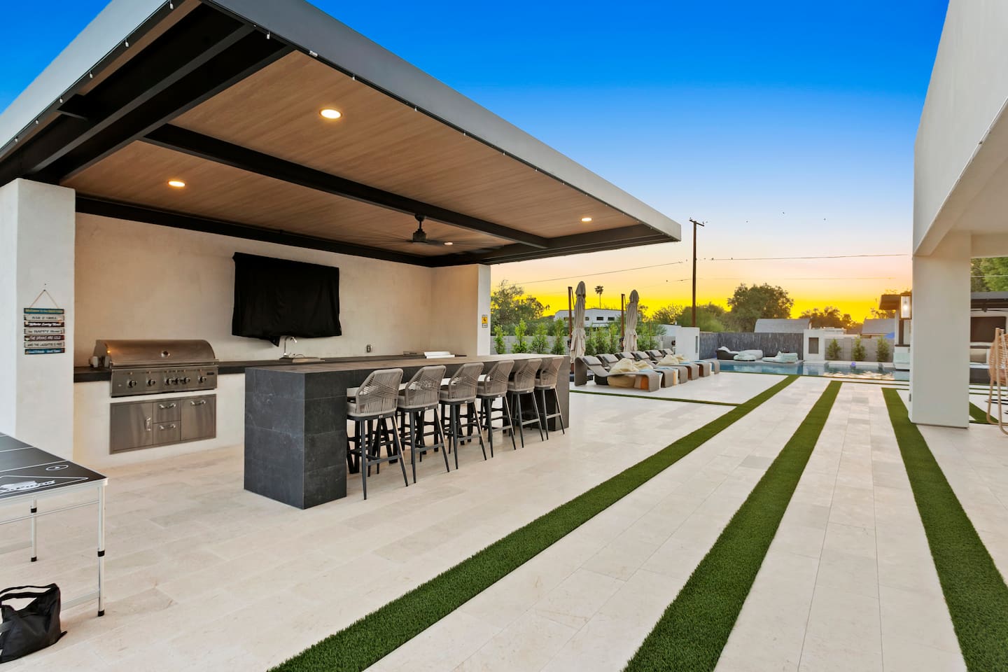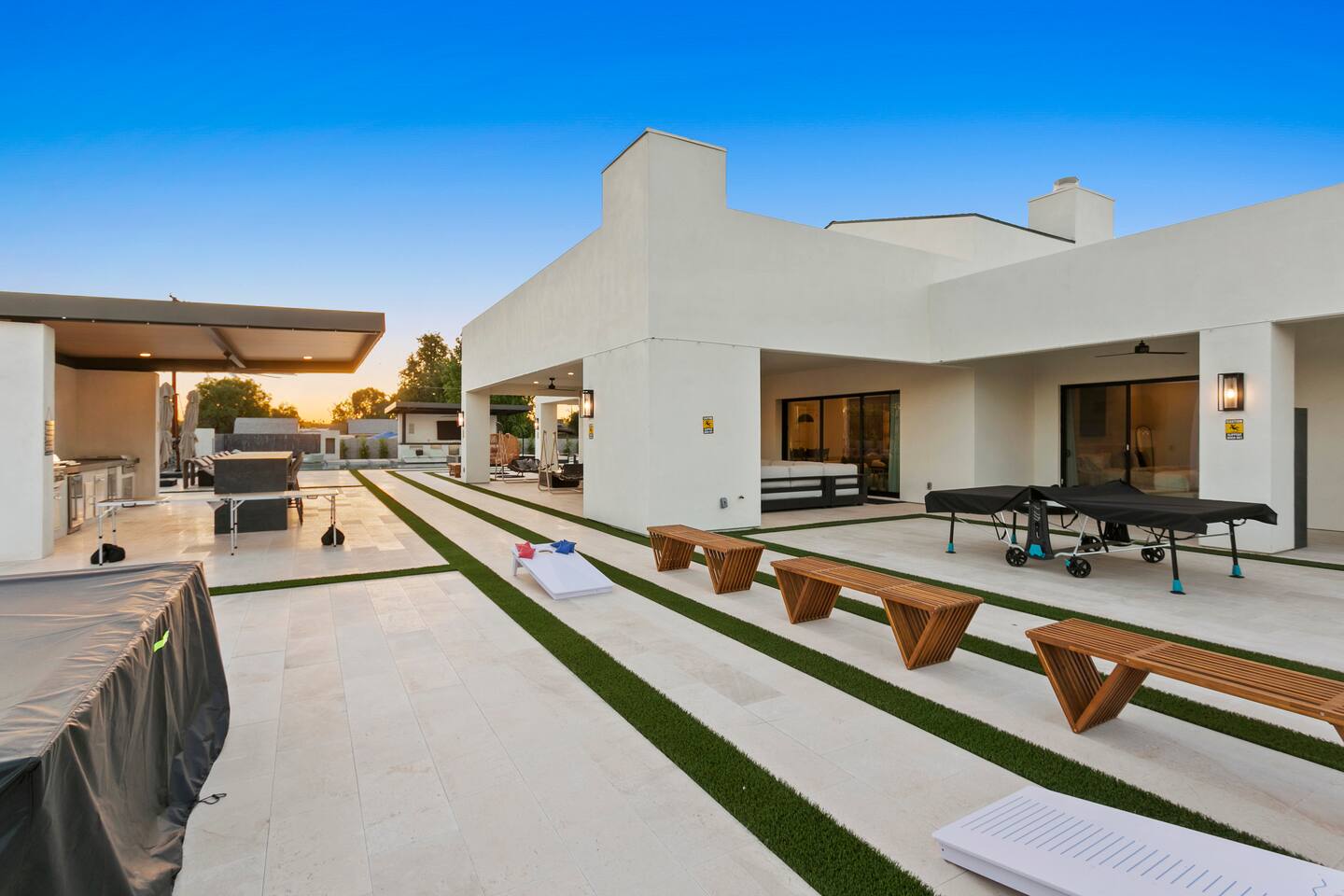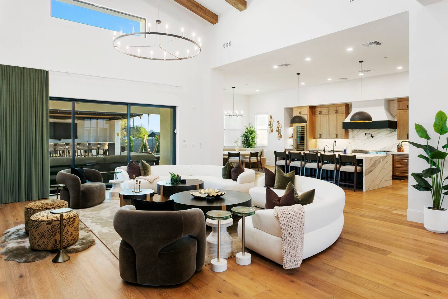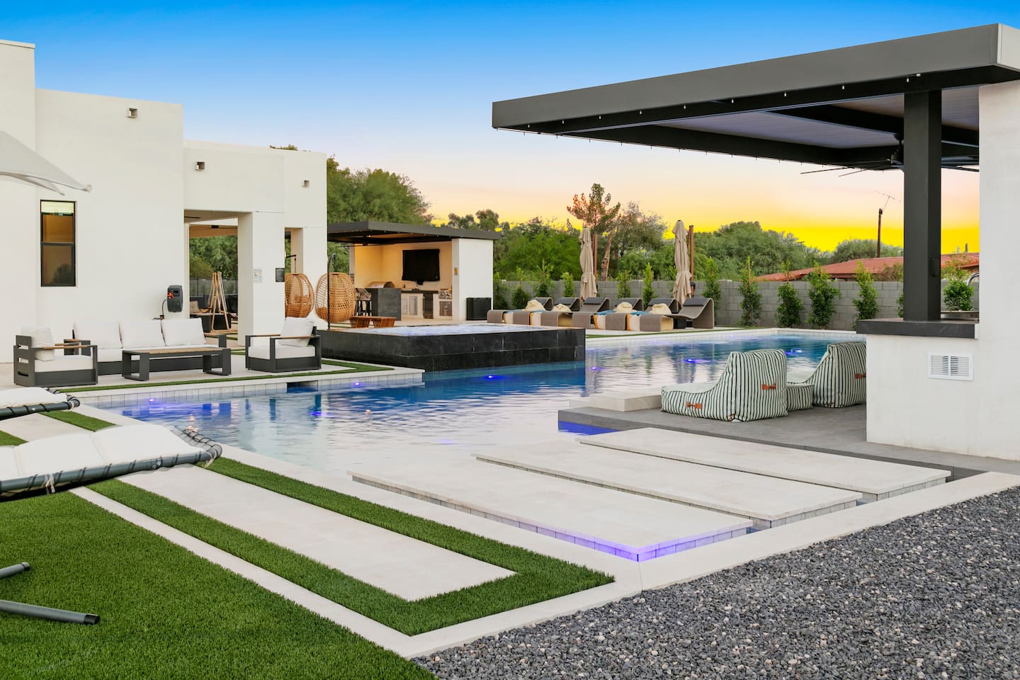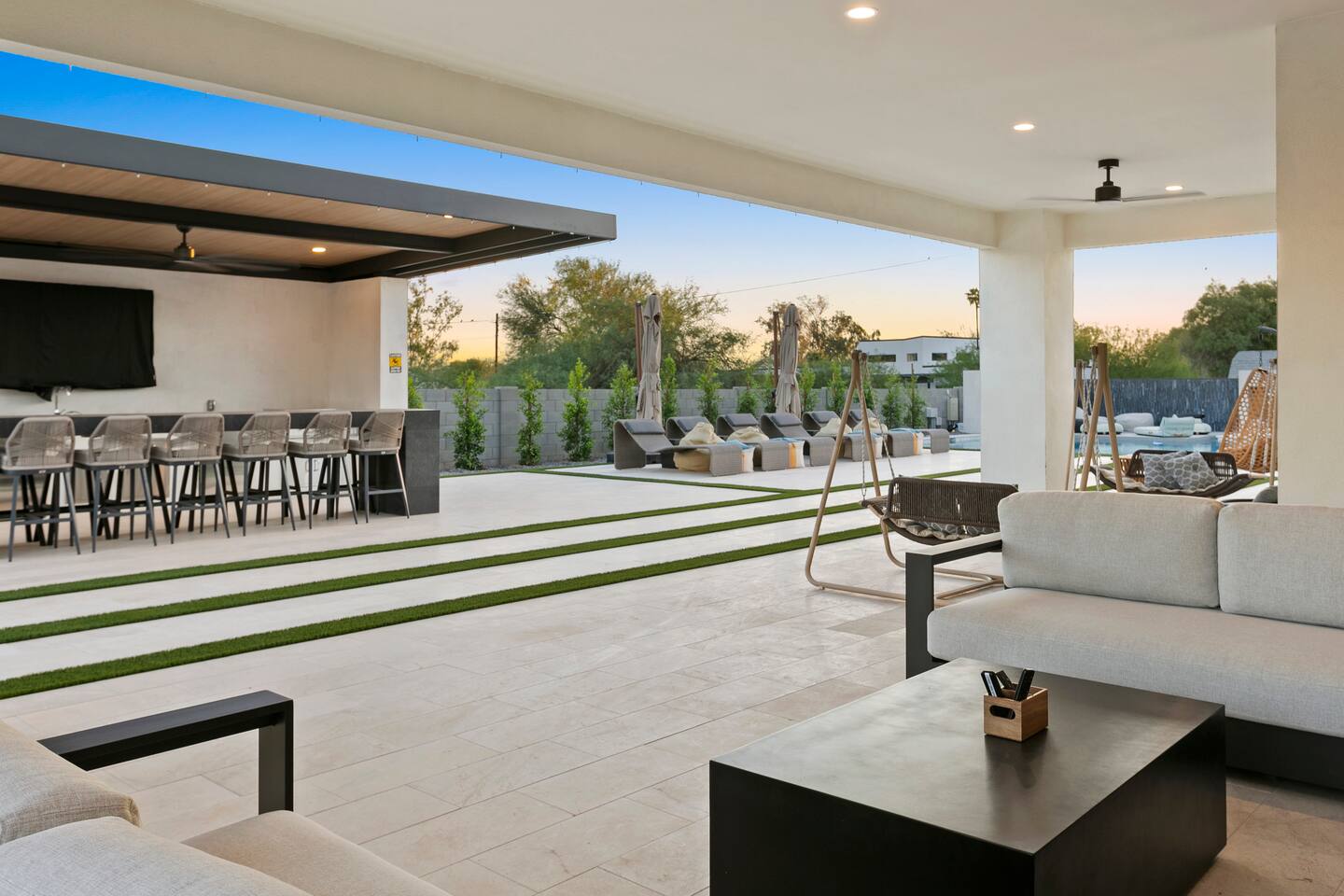Rooms & Spaces Private Suites: Retreat each night to spacious, elegantly appointed bedrooms featuring premium mattresses, plush linens, and serene décor. Many offer private or semi-private bathrooms, ensuring comfort and privacy for every guest. Nature-Inspired Movie Lounge: Step into a one-of-a-kind entertainment retreat where the outdoors meets the big screen. Our 132-inch projection screen, powered by a state-of-the-art AWOL short-throw projector, transforms the room into a private cinema—perfect for movie nights, binge-worthy series, or game-day excitement. Designed with a calming, nature-themed aesthetic, the space blends comfort with a touch of the outdoors, offering guests a cozy yet elevated vibe. The plush sectional doubles as a couch bed that sleeps up to 4, making this the ultimate spot for families, kids’ sleepovers, or friends who want to combine movie magic with a restful night’s sleep. Whether you’re looking to unwind after a day of golf and desert adventures or create a memorable family movie night, this room is built to impress and designed to relax. Spa-Inspired Bathrooms: Indulge in walk-in showers, soaking tub, and luxury toiletries that transform daily routines into spa moments. Grand Living Room: A sunlit great room with soaring ceilings, designer furnishings, and walls of glass that open seamlessly to the outdoors—perfect for gathering, relaxing, or celebrating. Gourmet Kitchen & Dining: A chef’s dream with top-tier appliances, expansive prep space, and seating for your entire group—ideal for cooking together or enjoying a catered dinner. Entertainment Pavilion: Your own private resort hub featuring a state-of-the-art golf simulator, lively ping pong battles, classic arcade speedball challenges, competitive foosball matches, a pickleball court, a basketball court (half) and a putting green for golf enthusiasts of all levels. A space designed for laughter, friendly rivalry, and unforgettable memories. Outdoor Oasis: A resort-style pool and spa featuring a swim-up bar and a soothing water wall, surrounded by shaded lounge areas with a fireplace, a BBQ station, and manicured grounds enhanced with cooling outdoor misters to keep you comfortable even on the hottest days. Gather around the cozy firepit for starlit evenings filled with warmth and conversation—perfect for sun-soaked afternoons and magical nights alike. List of amenities include: A pickleball court Half court basketball Celebrity Greens Putting Green (outdoor) Cornhole In pool seats Resort style pool with LED lighting and spa Firepit Misting system Convenient Parking: Ample on-site parking to accommodate all guests with ease. -------------------------------------------------------------------- Scottsdale Highlights & Travel Times 1. Old Town Scottsdale & the Arts District Immerse yourself in walkable galleries, stylish boutiques, Southwestern cuisine, and vibrant nightlife. • Drive time: Approximately 10–12 minutes (about 5 miles). 2. TPC Scottsdale & Waste Management Phoenix Open Home to the famed Stadium Course and its electrifying 16th-hole coliseum—this is golf like no other. • Drive time: Around 12–15 minutes (roughly 6–7 miles). 3. Taliesin West Explore Frank Lloyd Wright’s iconic desert compound and creativity hub—an architectural marvel you won't want to miss. • Drive time: Circa 15 minutes (approx. 7 miles). 4. Scottsdale Arabian Horse Show & Barrett-Jackson Auction (WestWorld) From the grandeur of the Arabian Horse Show to the classic car excitement at Barrett-Jackson and festive Parada del Sol, WestWorld delivers unmatched cultural flair. • Drive time: About 15 minutes (6–8 miles). 5. Arizona Boardwalk Attractions A family entertainment cluster featuring OdySea Aquarium, Butterfly Wonderland, Museum of Illusions, and more—perfect for all ages. • Drive time: Approximately 15 minutes (6–7 miles). 6. Luxury Spas, Shopping & Nightlife Spoil yourself at resorts like The Phoenician or enjoy high-end fashion and evening glamour at Scottsdale Fashion Square. • Drive time: Roughly 10–12 minutes to Scottsdale Fashion Square, and similar to nearby resort venues. Why Staying Here Is a Smart Choice • Central Location: You’re nestled in a serene upscale neighborhood that provides a peaceful refuge—yet you're just minutes from everything that makes Scottsdale unforgettable. • Something for Everyone: Whether it's art, history, golf, horses, family fun, or luxury indulgence, your guests won’t have to travel far. • Quick Access: With most top attractions just a short drive away, guests can maximize their time—whether they’re here for weekend play or a multi-day retreat.