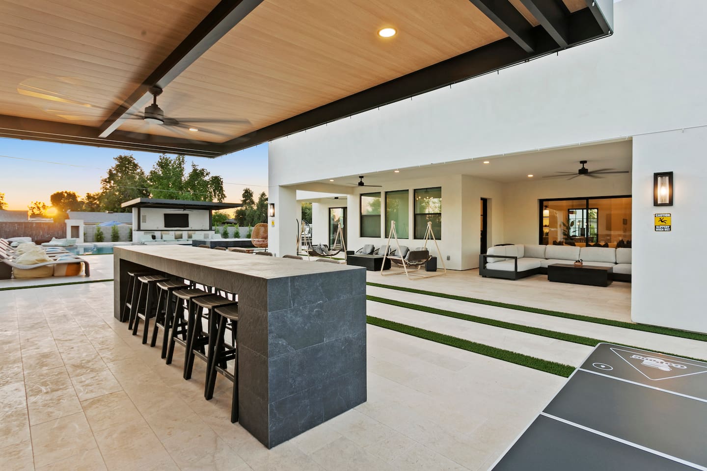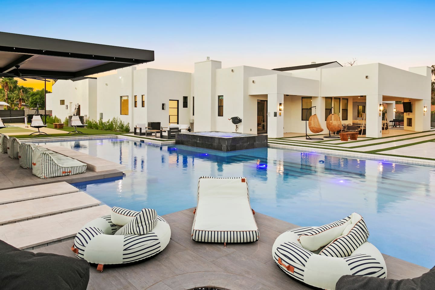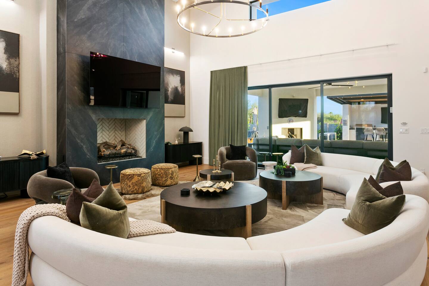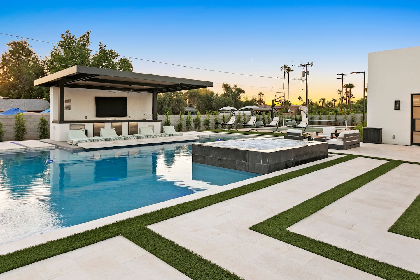 Rooms & Spaces Private Suites: Retreat each night to spacious, elegantly appointed bedrooms featuring premium mattresses, plush linens, and serene décor. Many offer private or semi-private bathrooms, ensuring comfort and privacy for every guest. Nature-Inspired Movie Lounge: Step into a one-of-a-kind entertainment retreat where the outdoors meets the big screen. Our 132-inch projection screen, powered by a state-of-the-art AWOL short-throw projector, transforms the room into a private cinema—perfect for movie nights, binge-worthy series, or game-day excitement. Designed with a calming, nature-themed aesthetic, the space blends comfort with a touch of the outdoors, offering guests a cozy yet elevated vibe. The plush sectional doubles as a couch bed that sleeps up to 4, making this the ultimate spot for families, kids’ sleepovers, or friends who want to combine movie magic with a restful night’s sleep. Whether you’re looking to unwind after a day of golf and desert adventures or create a memorable family movie night, this room is built to impress and designed to relax. Spa-Inspired Bathrooms: Indulge in walk-in showers, soaking tub, and luxury toiletries that transform daily routines into spa moments. Grand Living Room: A sunlit great room with soaring ceilings, designer furnishings, and walls of glass that open seamlessly to the outdoors—perfect for gathering, relaxing, or celebrating. Gourmet Kitchen & Dining: A chef’s dream with top-tier appliances, expansive prep space, and seating for your entire group—ideal for cooking together or enjoying a catered dinner. Entertainment Pavilion: Your own private resort hub featuring a state-of-the-art golf simulator, lively ping pong battles, classic arcade speedball challenges, competitive foosball matches, a pickleball court, a basketball court (half) and a putting green for golf enthusiasts of all levels. A space designed for laughter, friendly rivalry, and unforgettable memories. Outdoor Oasis: A resort-style pool and spa featuring a swim-up bar and a soothing water wall, surrounded by shaded lounge areas with a fireplace, a BBQ station, and manicured grounds enhanced with cooling outdoor misters to keep you comfortable even on the hottest days. Gather around the cozy firepit for starlit evenings filled with warmth and conversation—perfect for sun-soaked afternoons and magical nights alike. List of amenities include: A pickleball court Half court basketball Celebrity Greens Putting Green (outdoor) Cornhole In pool seats Resort style pool with LED lighting and spa Firepit Misting system Convenient Parking: Ample on-site parking to accommodate all guests with ease. -------------------------------------------------------------------- Scottsdale Highlights & Travel Times 1. Old Town Scottsdale & the Arts District Immerse yourself in walkable galleries, stylish boutiques, Southwestern cuisine, and vibrant nightlife. • Drive time: Approximately 10–12 minutes (about 5 miles). 2. TPC Scottsdale & Waste Management Phoenix Open Home to the famed Stadium Course and its electrifying 16th-hole coliseum—this is golf like no other. • Drive time: Around 12–15 minutes (roughly 6–7 miles). 3. Taliesin West Explore Frank Lloyd Wright’s iconic desert compound and creativity hub—an architectural marvel you won't want to miss. • Drive time: Circa 15 minutes (approx. 7 miles). 4. Scottsdale Arabian Horse Show & Barrett-Jackson Auction (WestWorld) From the grandeur of the Arabian Horse Show to the classic car excitement at Barrett-Jackson and festive Parada del Sol, WestWorld delivers unmatched cultural flair. • Drive time: About 15 minutes (6–8 miles). 5. Arizona Boardwalk Attractions A family entertainment cluster featuring OdySea Aquarium, Butterfly Wonderland, Museum of Illusions, and more—perfect for all ages. • Drive time: Approximately 15 minutes (6–7 miles). 6. Luxury Spas, Shopping & Nightlife Spoil yourself at resorts like The Phoenician or enjoy high-end fashion and evening glamour at Scottsdale Fashion Square. • Drive time: Roughly 10–12 minutes to Scottsdale Fashion Square, and similar to nearby resort venues. Why Staying Here Is a Smart Choice • Central Location: You’re nestled in a serene upscale neighborhood that provides a peaceful refuge—yet you're just minutes from everything that makes Scottsdale unforgettable. • Something for Everyone: Whether it's art, history, golf, horses, family fun, or luxury indulgence, your guests won’t have to travel far. • Quick Access: With most top attractions just a short drive away, guests can maximize their time—whether they’re here for weekend play or a multi-day retreat.