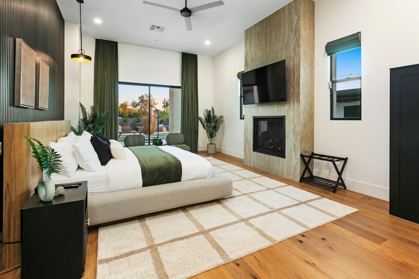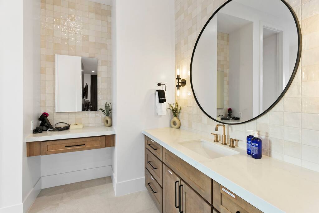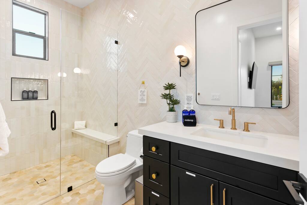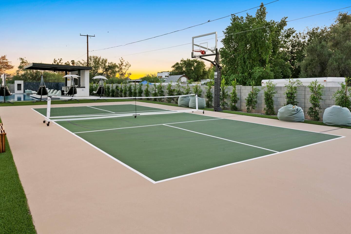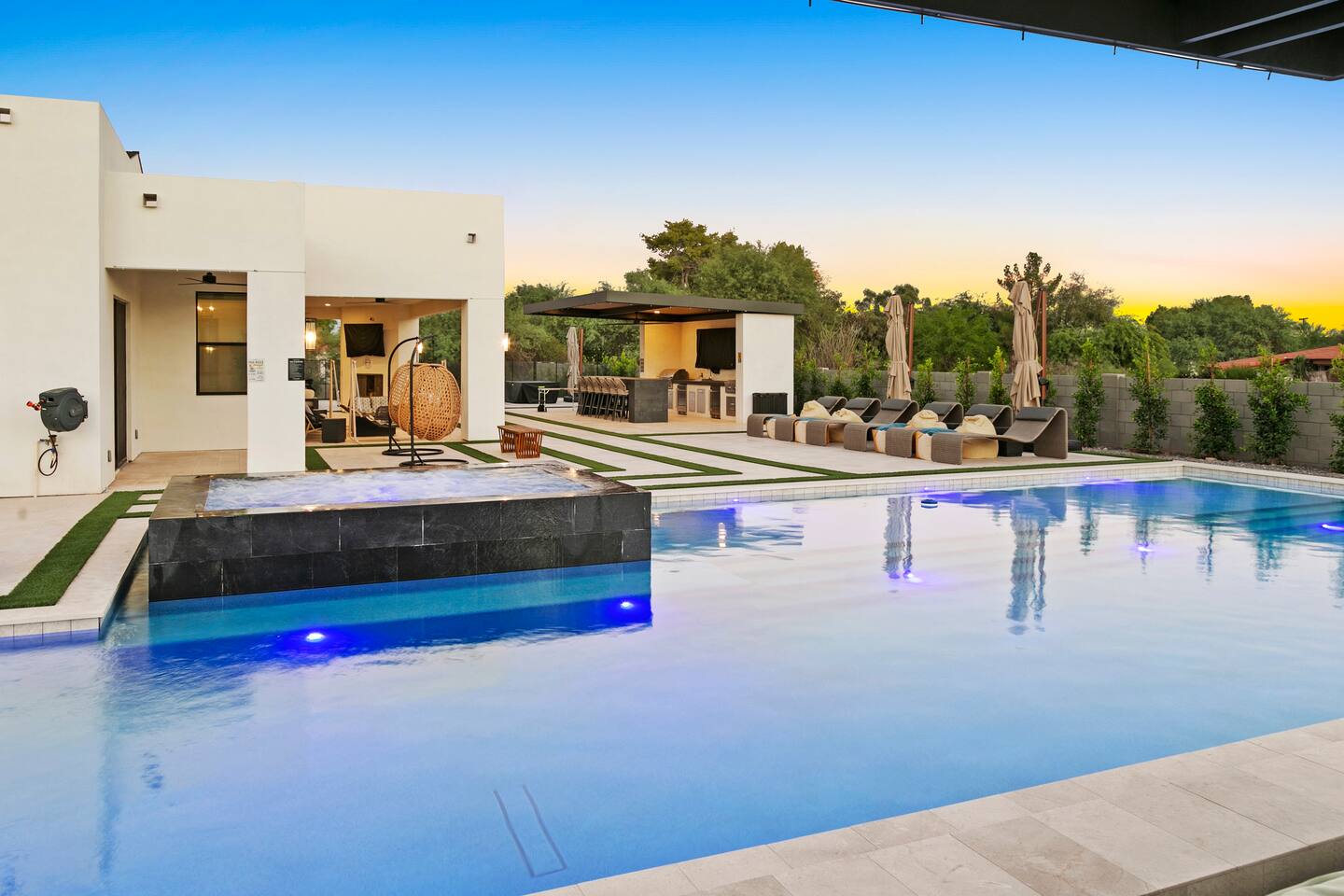 Rooms & Spaces Private Suites: Retreat each night to spacious, elegantly appointed bedrooms featuring premium mattresses, plush linens, and serene décor. Many offer private or semi-private bathrooms, ensuring comfort and privacy for every guest. Nature-Inspired Movie Lounge: Step into a one-of-a-kind entertainment retreat where the outdoors meets the big screen. Our 132-inch projection screen, powered by a state-of-the-art AWOL short-throw projector, transforms the room into a private cinema—perfect for movie nights, binge-worthy series, or game-day excitement. Designed with a calming, nature-themed aesthetic, the space blends comfort with a touch of the outdoors, offering guests a cozy yet elevated vibe. The plush sectional doubles as a couch bed that sleeps up to 4, making this the ultimate spot for families, kids’ sleepovers, or friends who want to combine movie magic with a restful night’s sleep. Whether you’re looking to unwind after a day of golf and desert adventures or create a memorable family movie night, this room is built to impress and designed to relax. Spa-Inspired Bathrooms: Indulge in walk-in showers, soaking tub, and luxury toiletries that transform daily routines into spa moments. Grand Living Room: A sunlit great room with soaring ceilings, designer furnishings, and walls of glass that open seamlessly to the outdoors—perfect for gathering, relaxing, or celebrating. Gourmet Kitchen & Dining: A chef’s dream with top-tier appliances, expansive prep space, and seating for your entire group—ideal for cooking together or enjoying a catered dinner. Entertainment Pavilion: Your own private resort hub featuring a state-of-the-art golf simulator, lively ping pong battles, classic arcade speedball challenges, competitive foosball matches, a pickleball court, a basketball court (half) and a putting green for golf enthusiasts of all levels. A space designed for laughter, friendly rivalry, and unforgettable memories. Outdoor Oasis: A resort-style pool and spa featuring a swim-up bar and a soothing water wall, surrounded by shaded lounge areas with a fireplace, a BBQ station, and manicured grounds enhanced with cooling outdoor misters to keep you comfortable even on the hottest days. Gather around the cozy firepit for starlit evenings filled with warmth and conversation—perfect for sun-soaked afternoons and magical nights alike. List of amenities include: A pickleball court Half court basketball Celebrity Greens Putting Green (outdoor) Cornhole In pool seats Resort style pool with LED lighting and spa Firepit Misting system Convenient Parking: Ample on-site parking to accommodate all guests with ease. -------------------------------------------------------------------- Scottsdale Highlights & Travel Times 1. Old Town Scottsdale & the Arts District Immerse yourself in walkable galleries, stylish boutiques, Southwestern cuisine, and vibrant nightlife. • Drive time: Approximately 10–12 minutes (about 5 miles). 2. TPC Scottsdale & Waste Management Phoenix Open Home to the famed Stadium Course and its electrifying 16th-hole coliseum—this is golf like no other. • Drive time: Around 12–15 minutes (roughly 6–7 miles). 3. Taliesin West Explore Frank Lloyd Wright’s iconic desert compound and creativity hub—an architectural marvel you won't want to miss. • Drive time: Circa 15 minutes (approx. 7 miles). 4. Scottsdale Arabian Horse Show & Barrett-Jackson Auction (WestWorld) From the grandeur of the Arabian Horse Show to the classic car excitement at Barrett-Jackson and festive Parada del Sol, WestWorld delivers unmatched cultural flair. • Drive time: About 15 minutes (6–8 miles). 5. Arizona Boardwalk Attractions A family entertainment cluster featuring OdySea Aquarium, Butterfly Wonderland, Museum of Illusions, and more—perfect for all ages. • Drive time: Approximately 15 minutes (6–7 miles). 6. Luxury Spas, Shopping & Nightlife Spoil yourself at resorts like The Phoenician or enjoy high-end fashion and evening glamour at Scottsdale Fashion Square. • Drive time: Roughly 10–12 minutes to Scottsdale Fashion Square, and similar to nearby resort venues. Why Staying Here Is a Smart Choice • Central Location: You’re nestled in a serene upscale neighborhood that provides a peaceful refuge—yet you're just minutes from everything that makes Scottsdale unforgettable. • Something for Everyone: Whether it's art, history, golf, horses, family fun, or luxury indulgence, your guests won’t have to travel far. • Quick Access: With most top attractions just a short drive away, guests can maximize their time—whether they’re here for weekend play or a multi-day retreat.