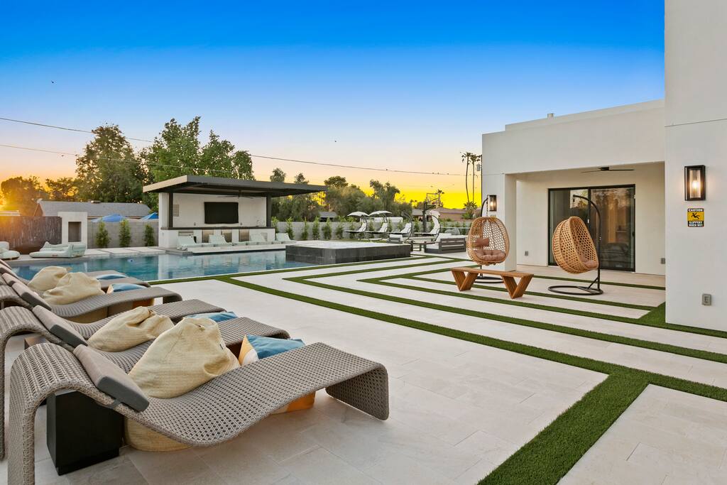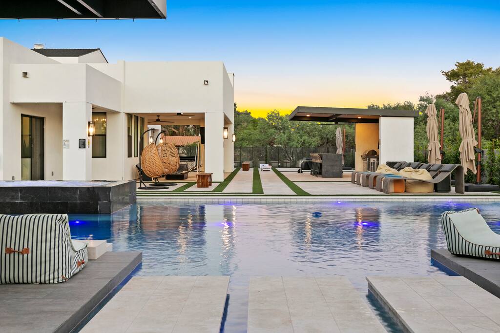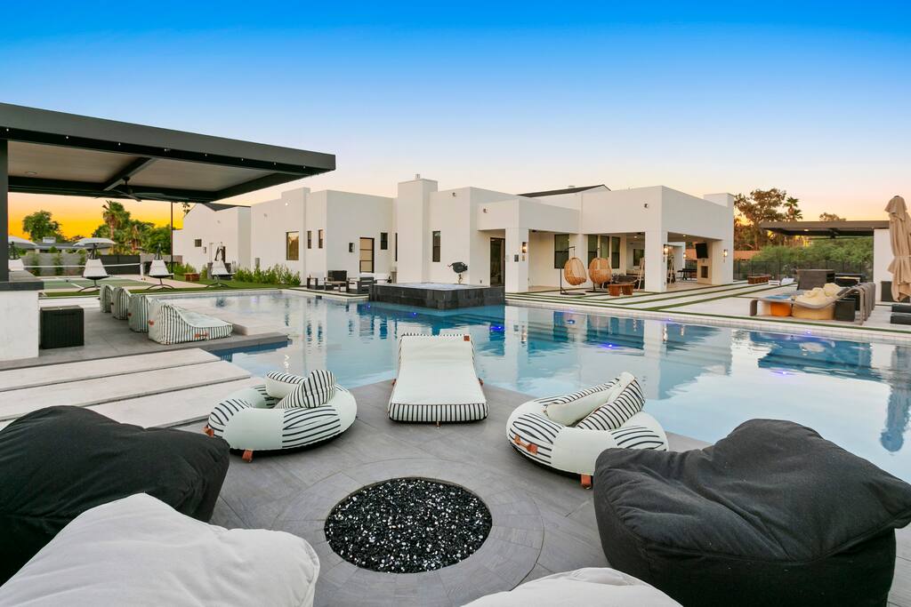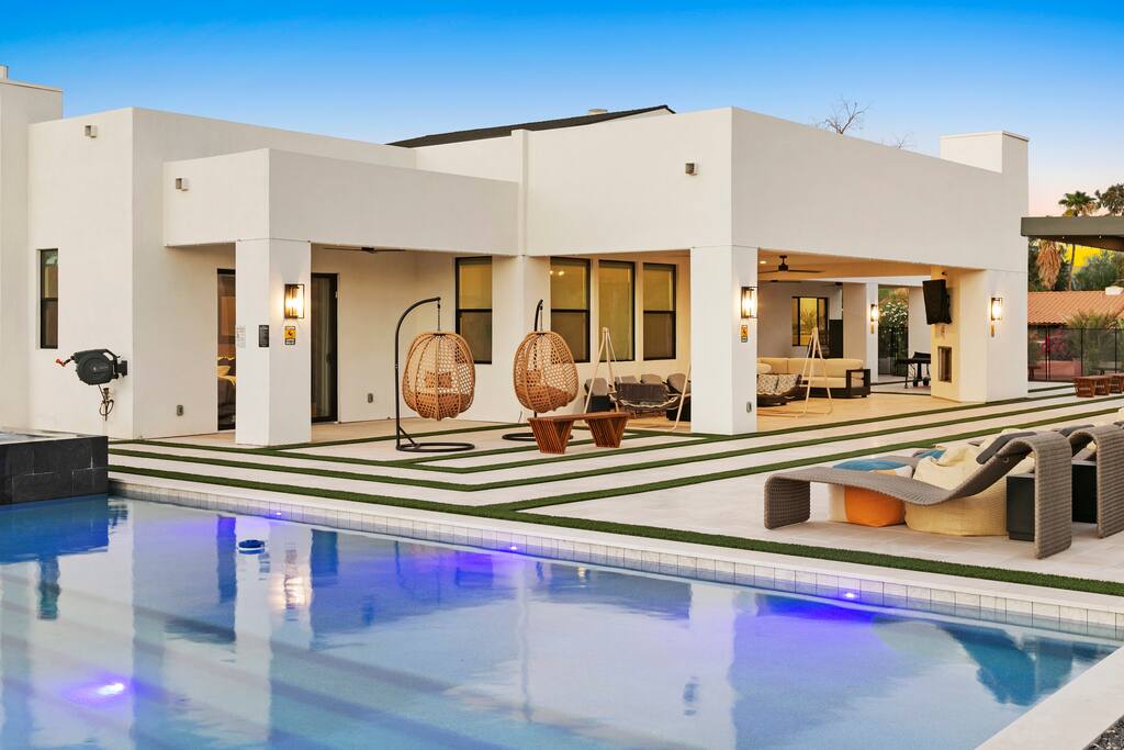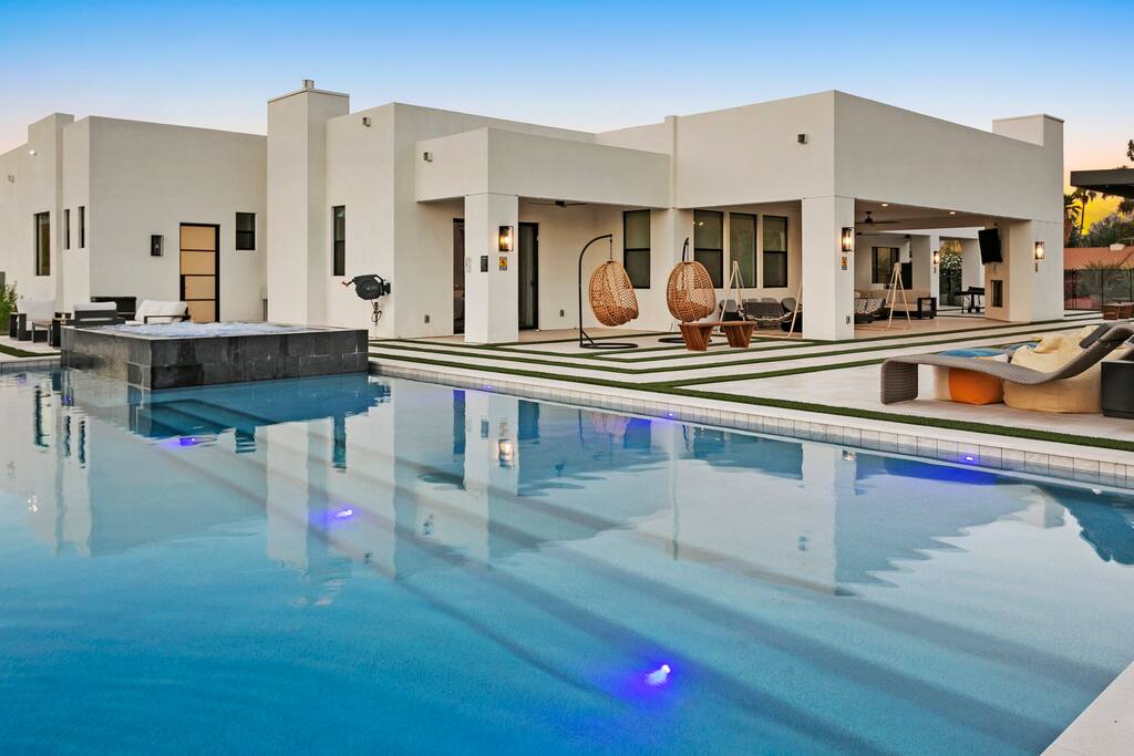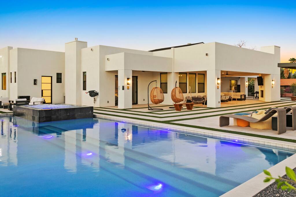✨Luxury 6BR Villa – Sleeps 22.✨ Private pickleball & half-court basketball, resort-style heated pool & spa with swim-up bar, movie lounge and golf simulator—all minutes from Old Town Scottsdale Kierland Commons and Scottsdale Quarter Entertainment pavilion: Pickleball, putting green, ping-pong outdoor pool table & arcade Resort pool, spa, firepit & misting system Designer kitchen + indoor/outdoor dining Keyless entry & super-fast response Book your Scottsdale showstopper retreat today!
